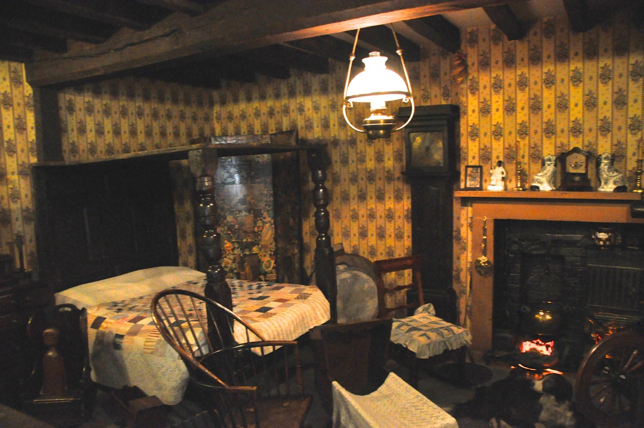 The Moorland Cottage, from about 1850, depicts a small rural house in Yorkshire (the rest of the building would house livestock). The peat-burning fire was the center of family activity and was used for heating, cooking, and providing hot water. The furnishings are practical rather than decorative, and often home-made. Furniture like the bed would be passed down over generations.